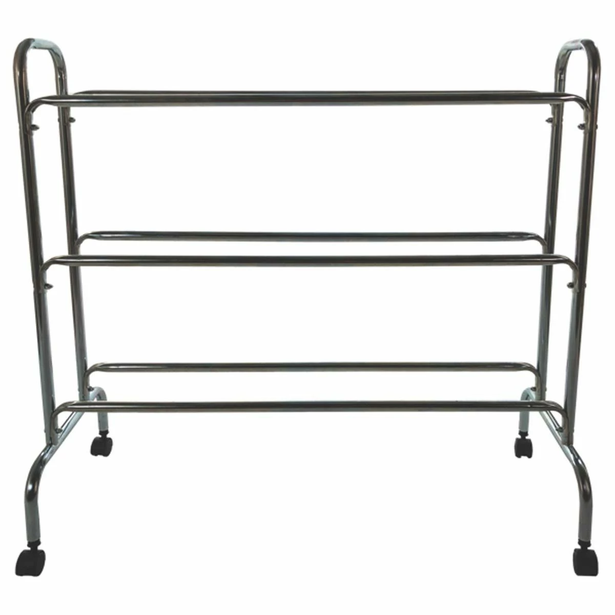 The easy to assemble Champion Basketball Ball Rack measures 41″L x 17″W x 40″H and holds 12 basketballs or volleyballs on three shelves. This ball rack is designed with a heavy, chrome-plated steel tube construction has four non-marking casters for easy maneuverability.
