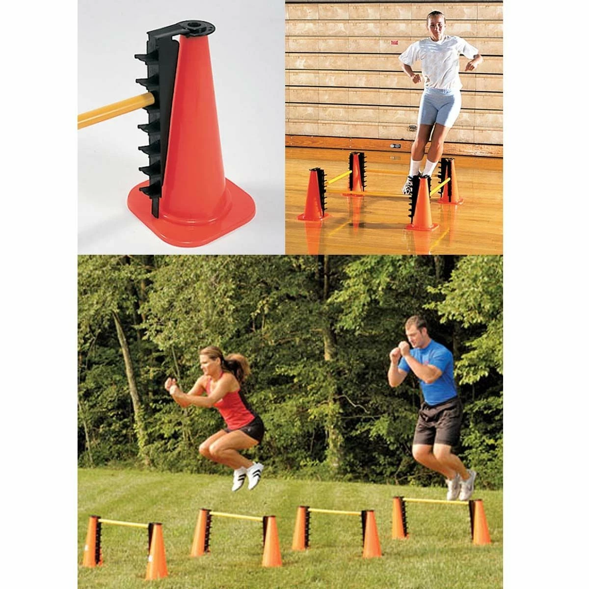 The Hurdle Cone Set is ideal for agility, speed and plyometric exercise drills. Run faster, jump farther training with this cone hurdle set. Adjustable from 4” to 18”, the multiple set-up options let you create different patterns for developing quick foot lift and control.