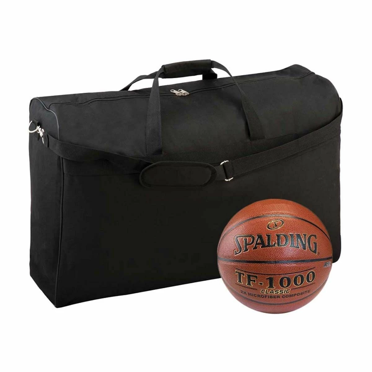This deluxe travel bag is a heavy-duty reinforced nylon basketball carrying bag. Full zipper across the top of the bag for easy closure. There is also a reinforced web handle with a detachable shoulder strap to make for convenient travelling. Holds 6 inflated basketballs so you’ll never have to go searching for a pump again.!