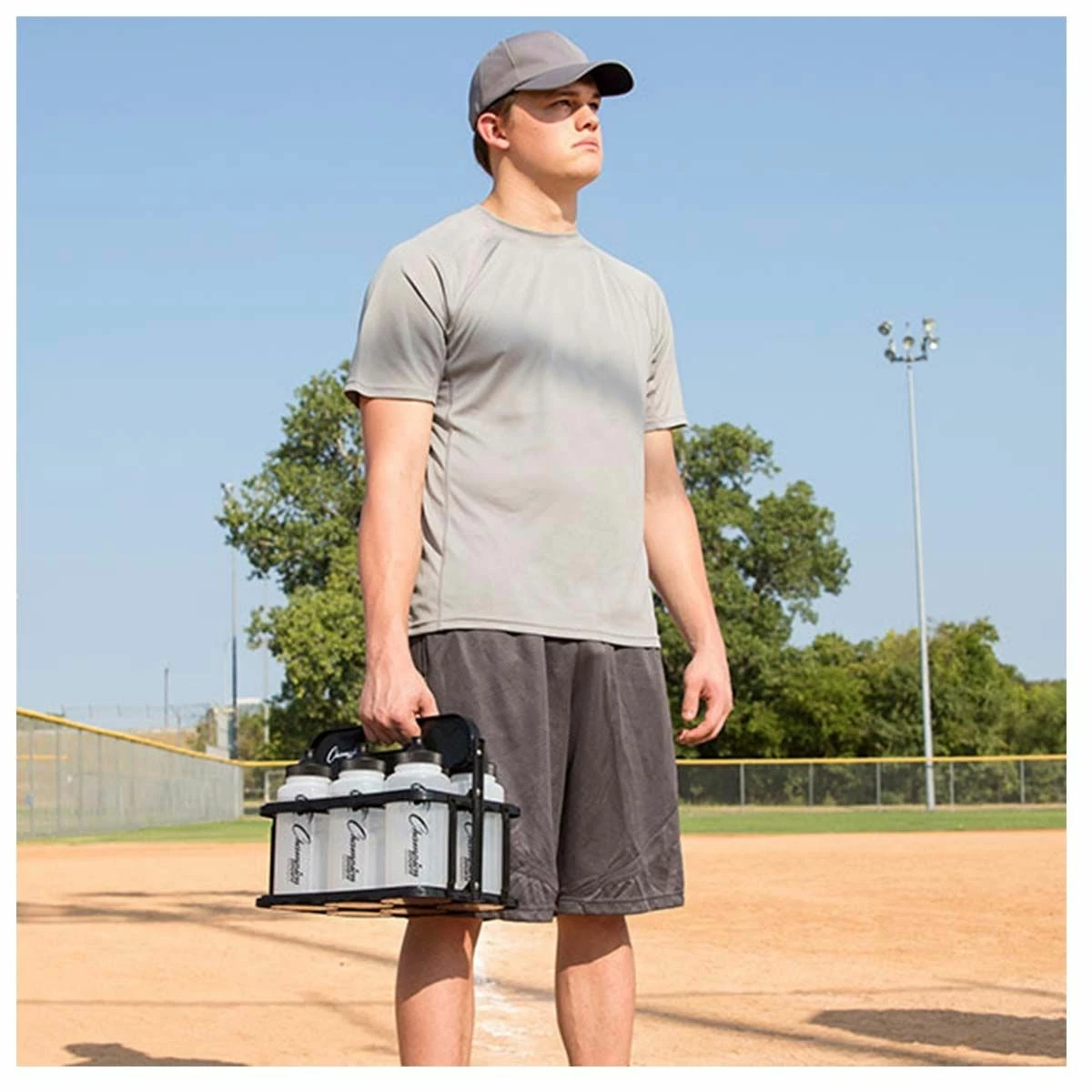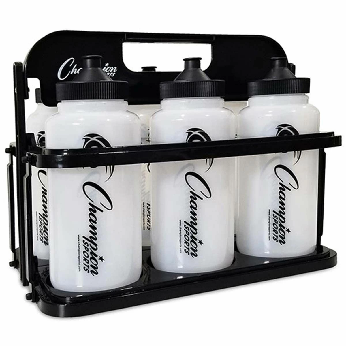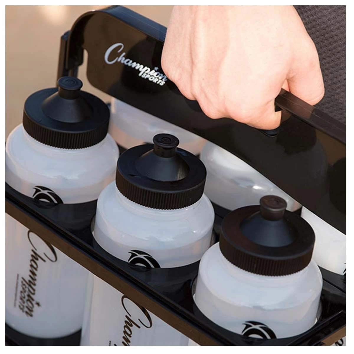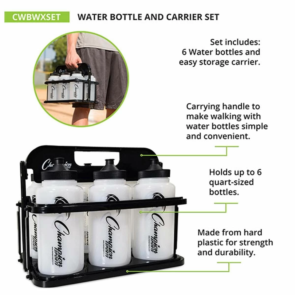 This water bottle and carrier set includes six 1-quart polyethylene squeeze bottles and a collapsible carrier. These comfort-grip squeeze bottles have a push/pull lid and high volume flow for reducing germ transfer and a wide opening for easily adding ice. Â