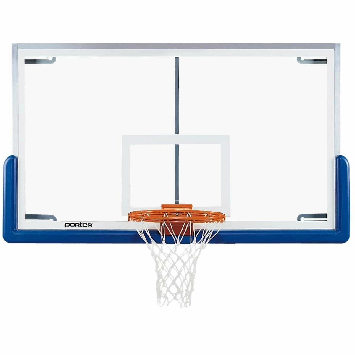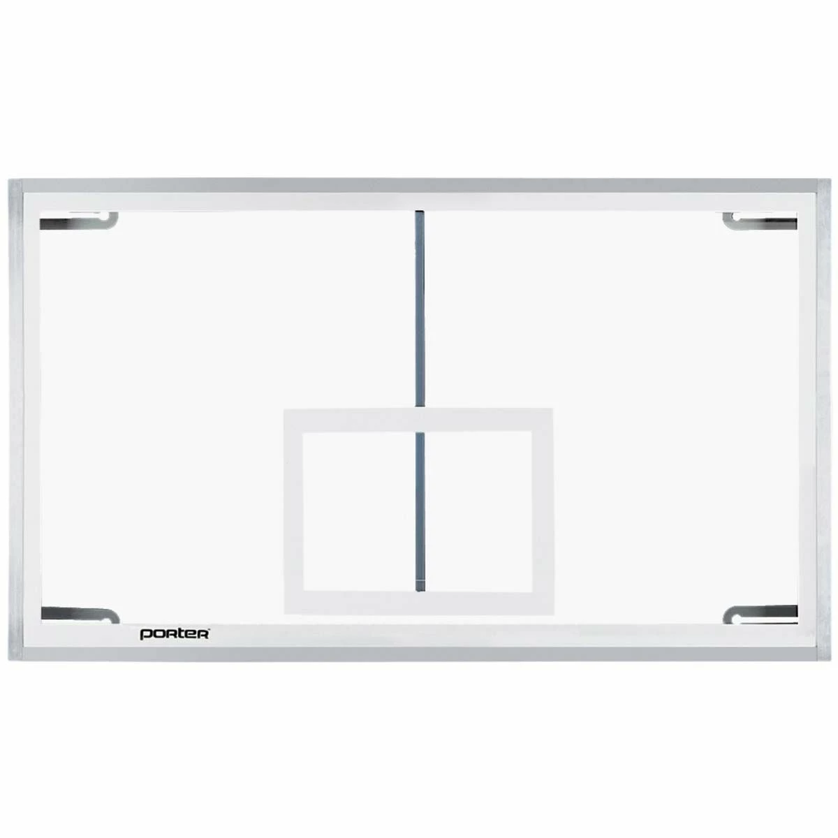 The Porter Pro-Strut glass backboard is official sized, 42″ x 72″, and includes a vertical Center-Strut goal support and a four corner attachment support frame. This design allows installation on wall-mount units, double-drop (H-frame) overhead supported units or old style support systems. Brushed aluminum extrusions secure 1/2″ thick, fully tempered glass to the unitized steel frame. The official white border and target area are fired into the glass.