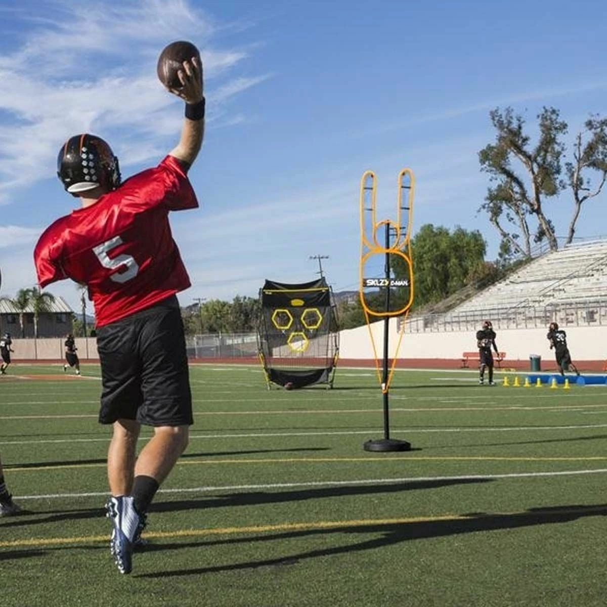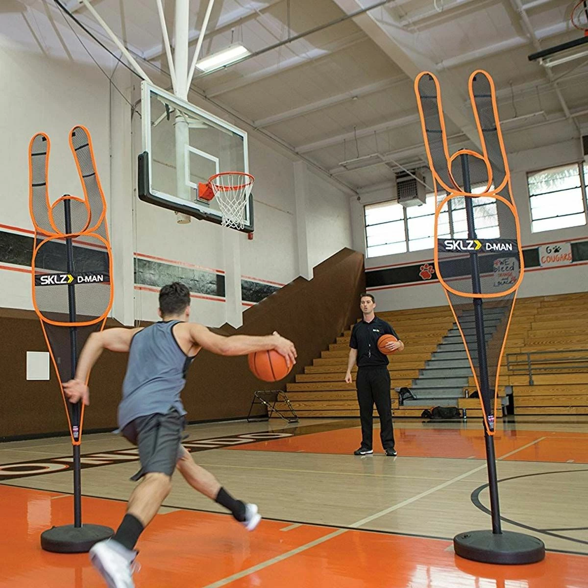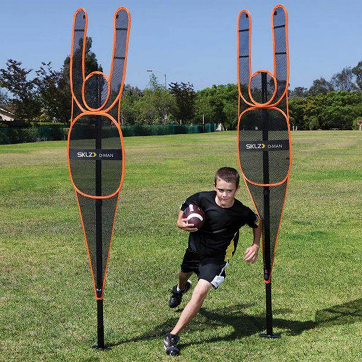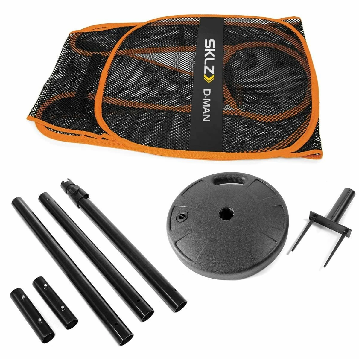 The SKLZ D-Man portable hands-up defensive mannequin is the perfect practice partner for basketball players. The D Man training aid teaches players to shoot, pass over or around defenders in the “hands-up” position. It is an effective training aid for teaching crisp passing and getting off the proper shot. Use the D Man to practice versus one defender or set up multiple D-Men to simulate practice against a whole team (additional D Man mannequins sold separately). The D Man is a great tool for coaches to evaluate a player’s shooting and passing ability in game situations. Basketball coaches use the D Man for drills like the pick and roll, off the screen drills, pump fake drills, and practicing high arc shots. The D Man is also an effective training aid for football, allowing coaches to set up passing drills for quarterbacks and running drills for offensive backs. The height of the D Man easily adjusts up to 6’6″, giving you various defensive options for training. The D Man features a body material made of durable, lightweight polyester mesh that is built to last, and is easy to transport to practice. The unit also includes a weighted base (sand not included) for stability on indoor surfaces, as well as ground stake attachments for additional stability on grass fields. The D Man sets up and breaks down in minutes, giving you more time to improve your skills and less time devoted to setting up the practice field or court. Whether you are simulating play against a solo defender or a against a defensive team, the SKLZ D Man is a terrific tool to improve your dribbling, passing, driving and positioning. Get yours today and start building a championship team!