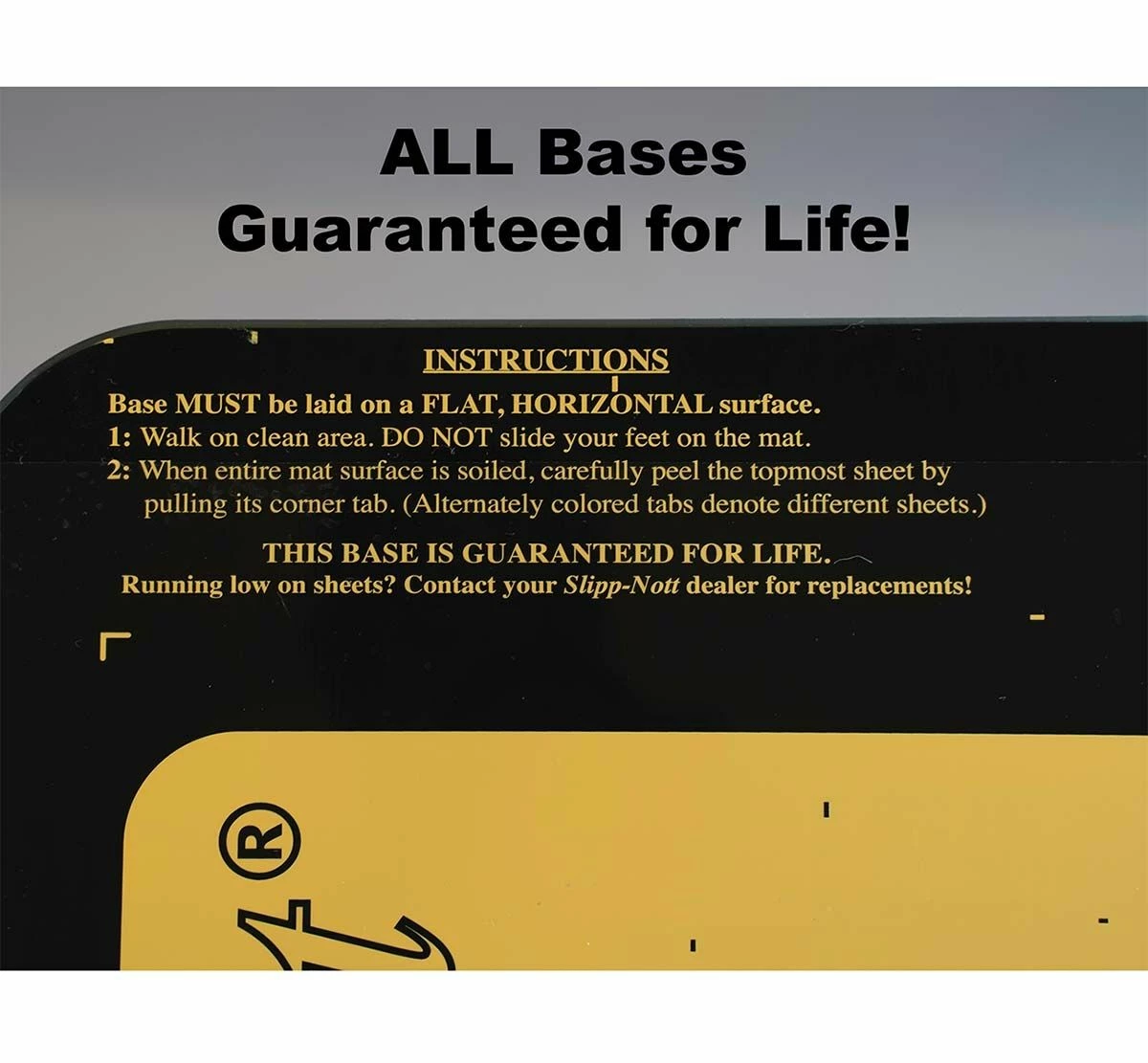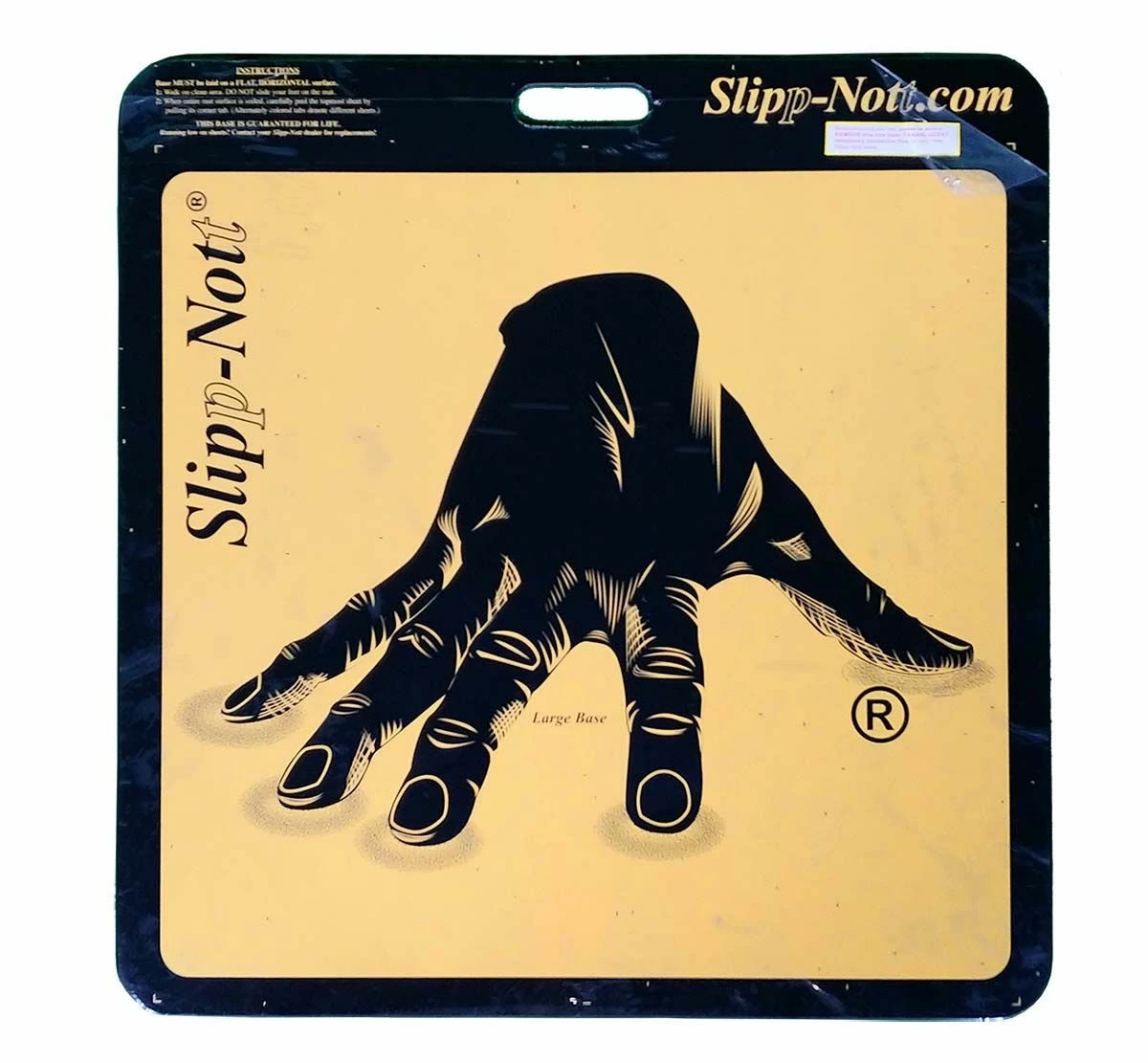 The Slipp-Nott LS60 Sticky Mat Base & Sheets Set (Large) is a shoe traction system that eliminates hand wiping of shoe soles for better traction and less slippage. Great for basketball, volleyball and other indoor sports. Removes dust, dirt and wax build-up from athletic shoe soles with one quick action. Contains one large base and one mat package of 60 sheets. Rip off and discard the sheets as they become soiled. Ribbed rubber bottom for floor protection. For storage, keep the mat flat and out of the sun