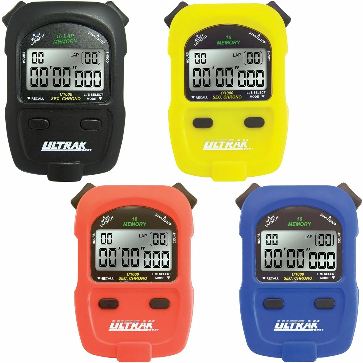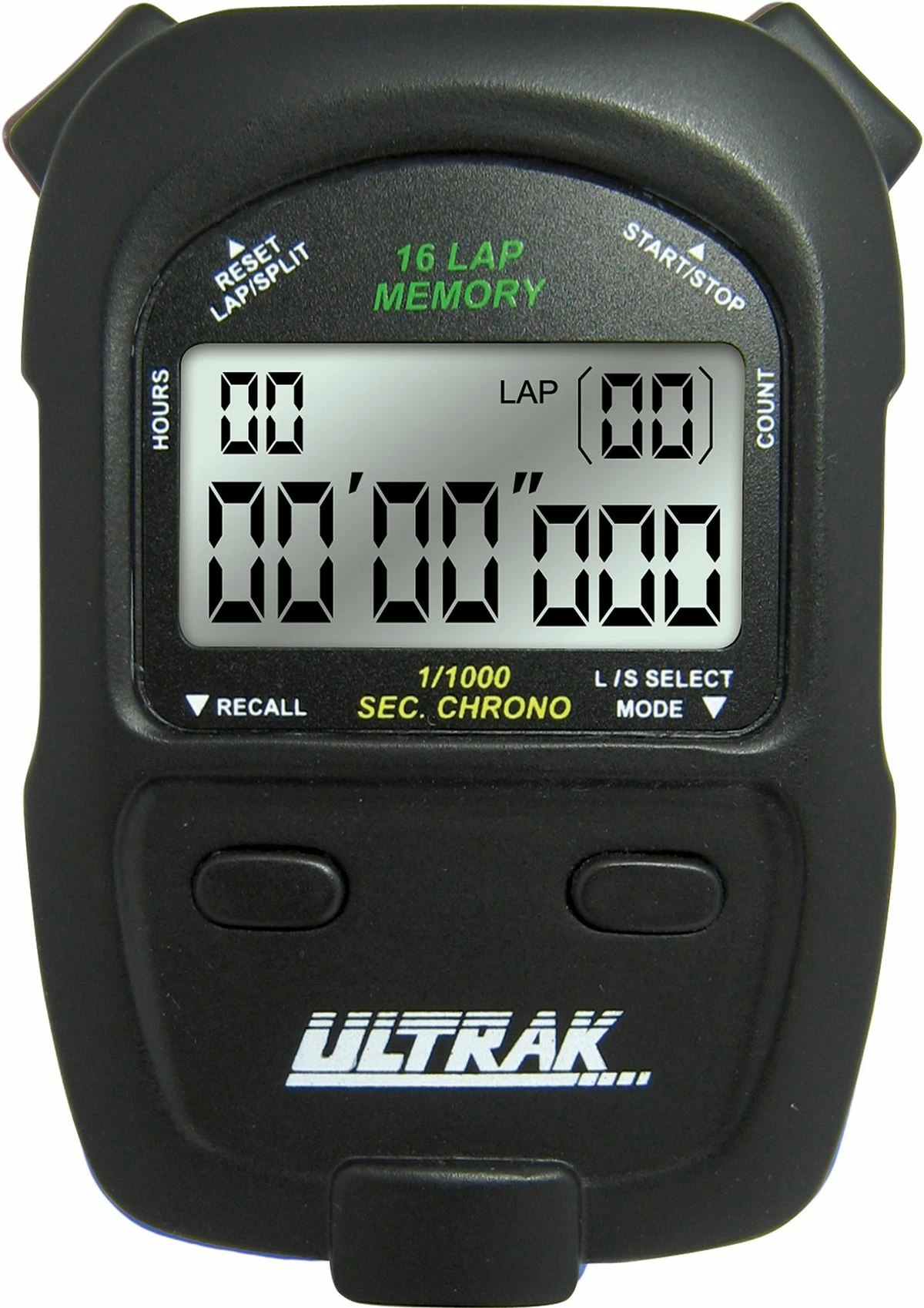 The Ultrak 460 16 lap memory stopwatch offers 16 dual split recallable memory, tracks laps or cum splits, measures to 100 hours with 1⁄1000 second resolution and has automatic split release. This water-resistant stopwatch can recall and take splits during operation and displays all information with extra-large digits.